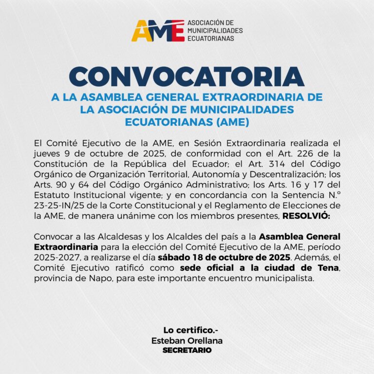 AME es la Institución que representa y fortalece a los 221 Municipios del Ecuador. Brindamos Asistencia Técnica, Capacitación y Acompañamiento para mejorar la Gestión Local, impulsar la descentralización y Garantizar Servicios Públicos eficientes para la ciudadanía. Con presencia a Nivel Nacional, AME es una Aliada Estratégica en el camino hacia ciudades más Sostenibles, Inclusivas y Resilientes, donde el desarrollo local se convierte en el motor del bienestar colectivo.