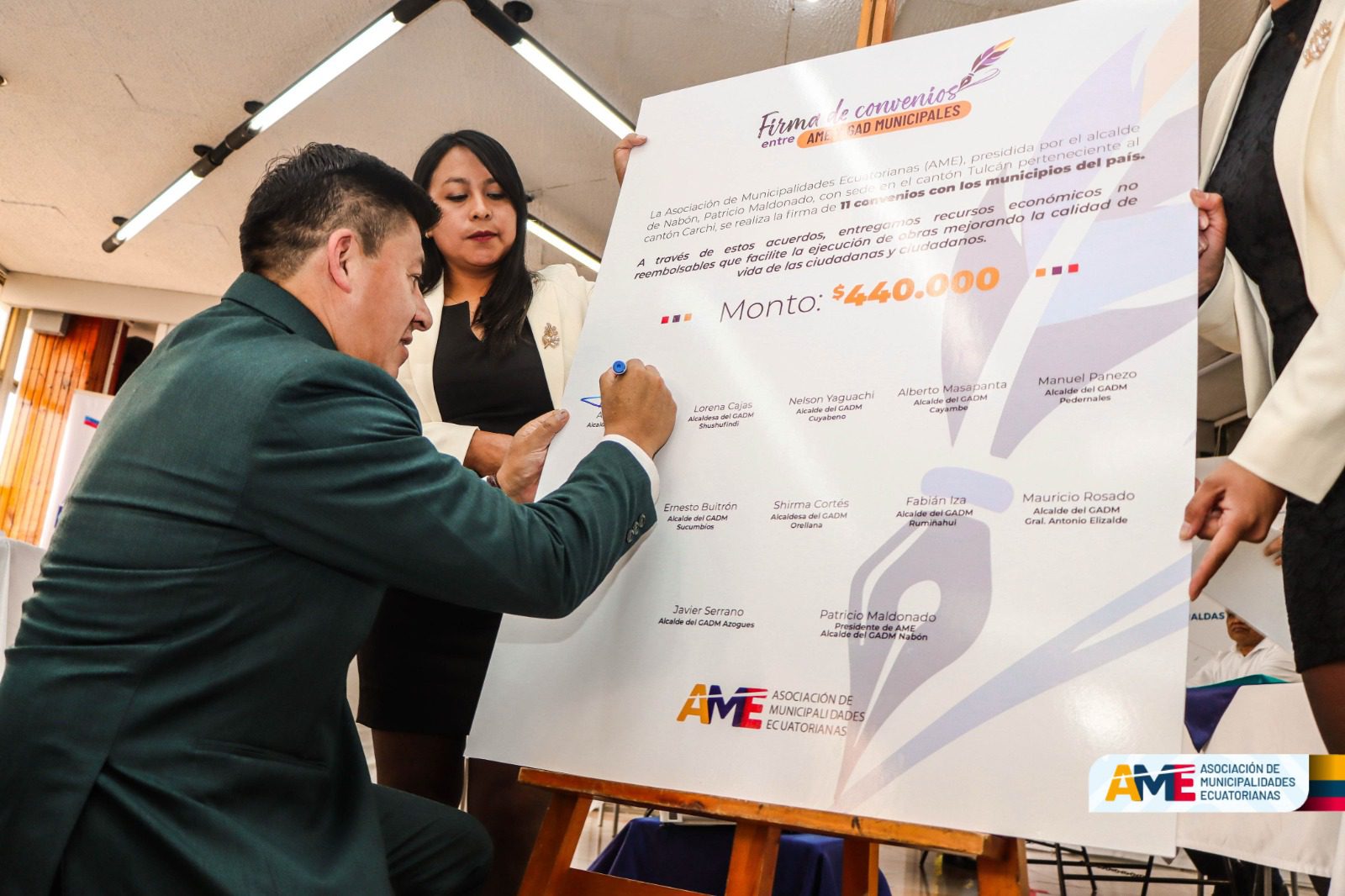 En un acto trascendental para el fortalecimiento del desarrollo municipal, la Asociación de Municipalidades Ecuatorianas (AME) suscribió convenios de cooperación con los municipios de Tulcán, Cuyabeno, Shushufindi, Sucumbíos, Rumiñahui, Orellana y Cayambe, por un monto que supera los 400 mil dólares. La ceremonia se llevó a cabo en el cantón Tulcán y contó con la presencia del presidente de la AME, Patricio Maldonado; del vocal del Comité Ejecutivo y alcalde de Espejo, Arnaldo Cuacés y de los alcaldes y alcaldesas Lorena Cajas, Shirma Cortés, Andrés Ruano, Ernesto Buitrón, Nelson Yaguachi, Alberto Masapanta y Fabián Iza.