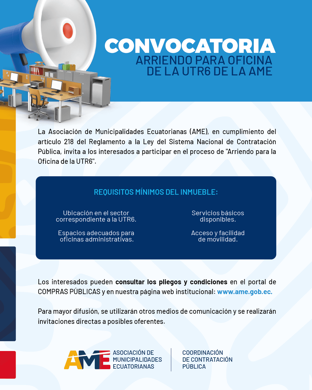 La Asociación de Municipalidades Ecuatorianas (AME), en cumplimiento del artículo 218 del Reglamento a la Ley del Sistema Nacional de Contratación Pública, invita a los interesados a participar en el proceso de “Arriendo para la Oficina de la UTR6”.